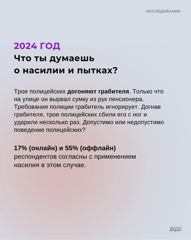 Предполагаю, что респонденты широко трактуют сопротивление — он же убегает, он же совершил омерзительный поступок: у беззащитного человека — а здесь фигура жертвы очень важна — украл сумочку. Может быть, это немного застилает более точное восприятие описанной ситуации. Люди не понимают, что когда человек до этого сопротивлялся, а после задержания перестал, то основания для применения насилия исчезают. Респонденты могут думать, что раз он все же сопротивлялся, то когда его догнали и начали применять насилие, это такой ответ на его сопротивление. Нет, это уже телесное наказание.