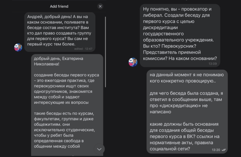 Утром 11 августа она вступила по ссылке в закрытый чат студентов. Молодой человек удалил ее оттуда, предварительно объяснив, что это беседа исключительно для учащихся. Далее все перешло в личные сообщения, где Левдина назвала Андрея «провокатором», который дискредитирует институт. Коньков признается, что никогда не преследовал таких целей.