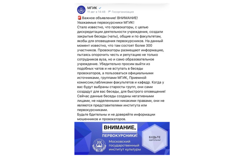 В тот же день в официальных каналах МГИКа появились посты, в которых без имен студентов обвинили в «провокации», а также призвали первокурсников не вступать в беседы или удалиться оттуда. Все возмущенные комментарии к этим постам сотрудники удаляли, а потом и вовсе запретили их комментировать, рассказал Андрей.  Позднее пост о «провокаторских беседах» был удален.