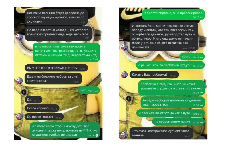 Один из учащихся написал Левдиной в личные сообщения и попросил объяснить причину удаления его комментариев. В переписке, которая есть в распоряжении редакции, Екатерина стала угрожать студенту полицией, а также предупредила: все студенческие чаты читаются руководством. Также она заявила, что у администрации есть информатор, который «сливает ей сообщения» из другой беседы — чата общежития МГИКа «Корпус Б» (у МГИКа есть три общежития А, Б и В — прим. «Черта»). В нем, как считает Левдина, студенты насмехались над трагедией на Крымском мосту.