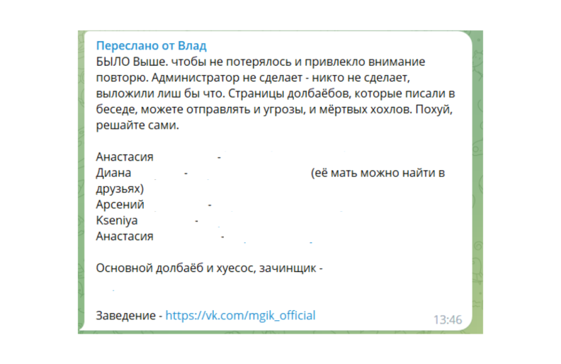 Один из студентов МГИКа Дмитрий (имя изменено) рассказал «Черте», что его и его родственников стали обзывать «свиньями», «либеральной петушней» и напрямую угрожать расправой. Скриншоты оскорблений есть в распоряжении редакции. По словам Дмитрия, на данный момент, он и другие студенты очень испуганы и удалили свои личные страницы.