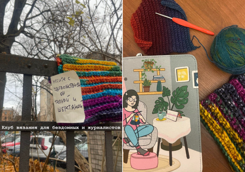 Сейчас я нахожусь в Латвии. Здесь много деклассированных людей в очень бедном положении. Я часто вяжу шарфы и снуды, чтобы отвлечься и успокоиться. А когда что-то делаешь, хочется, чтобы это имело смысл. Моя скорость производства — шесть шарфов в месяц, и в какой-то момент я стала развешивать их на заборах с запиской, что можно забирать и носить.