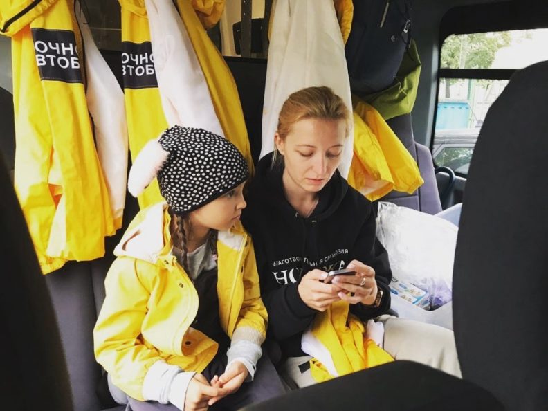 Первый раз я была в «Ночлежке» в Петербурге. Мне было пять и я не так много помню. Помню, что в офисе каталась со второго этажа на первый на трубе и в первый раз ела шаверму, а потом ездила на Ночном автобусе. Во время рейса хотелось спать и есть — было поздно, и Даша хвалила меня, что я не заснула. Помню, что раздавала бездомным людям хлеб и бутылки с водой. Страшно не было, было любопытно.