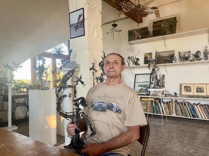 В помещении с большими окнами, выходящими на поле и берег реки, выставлены десятки работ скульптора. На рабочем столе лежат папки, где Волков собрал фотографии его первых поделок из пластилина и студенческих работ, старые фото родственников и брошюры с творчеством его детей и внука. Скульптор перелистывает эти страницы, рассказывая о собственной жизни.