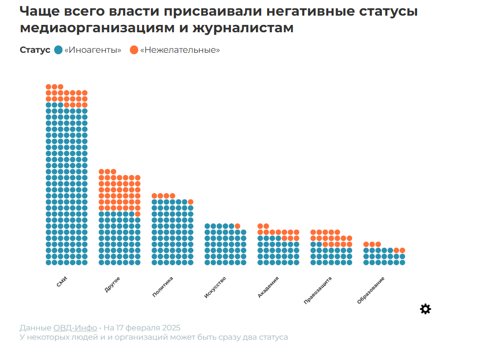 Из-за войны власти присвоили негативные статусы 557 людям и организациям. Большинство из них — «иностранные агенты» (444), остальные 107 — признаны нежелательными. Чаще всего такие статусы получали медиаорганизации и журналисты. По политически мотивированным антивоенным уголовным делам в заключении находятся 38 журналистов и блогеров.